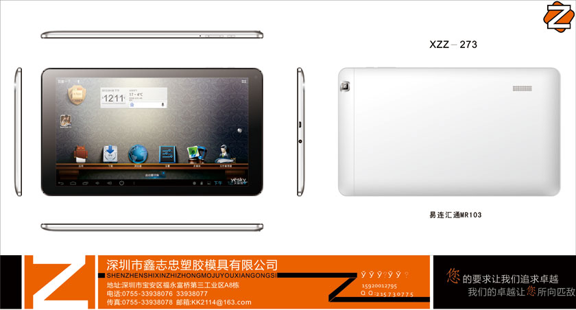 產(chǎn)品型號:ZZ-273方案:易連匯通MR103,隆科M101工藝:塑膠尺寸:10.1寸建議單價:RMB13元底殼可區(qū)分:紋路與光面,可做素材、噴油。